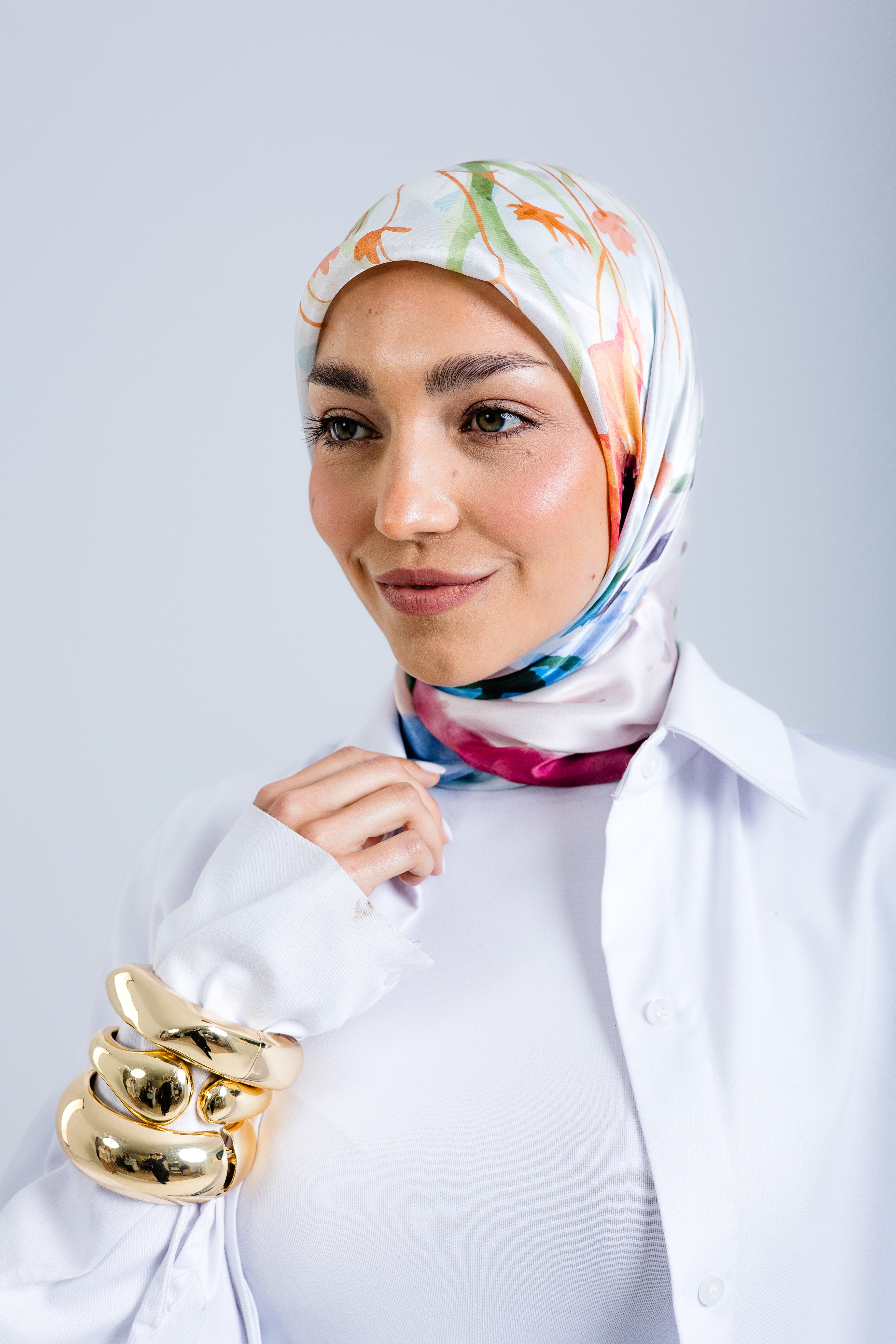 From Worood’s floral silk scarves, the Square Silken Flora Silk Scarf is a premium silk fabric scarf crafted from natural silk, blending artistry, femininity, and grace in every pastel bloom.